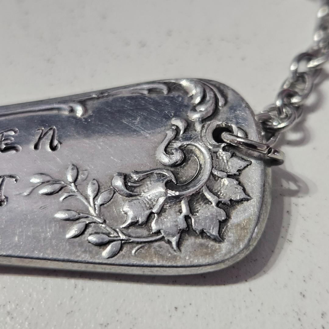 Questa collana è stata realizzata a mano con il manico di una posata francese originale degli anni Sessanta, in alluminio inciso a mano. Il ciondolo conserva le decorazioni floreali d’epoca ed è stato trasformato in un pezzo unico e ribelle con la scritta Queen Shit.