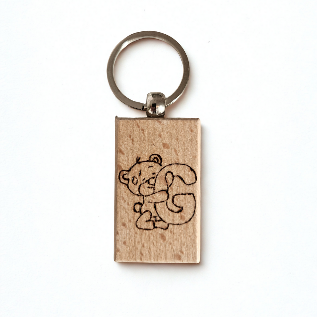 Portachiave in legno pirografato “Orsetto con lettera personalizzata” | Incisi a Fuoco