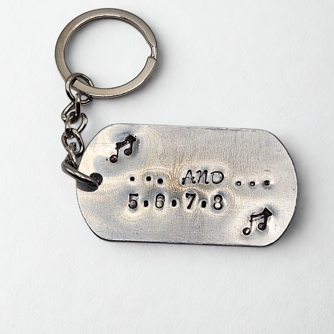 Questo portachiavi sportivo è realizzato a mano, timbrato uno a uno con la frase iconica “...and 5,6,7,8...” e due note musicali 🎶.