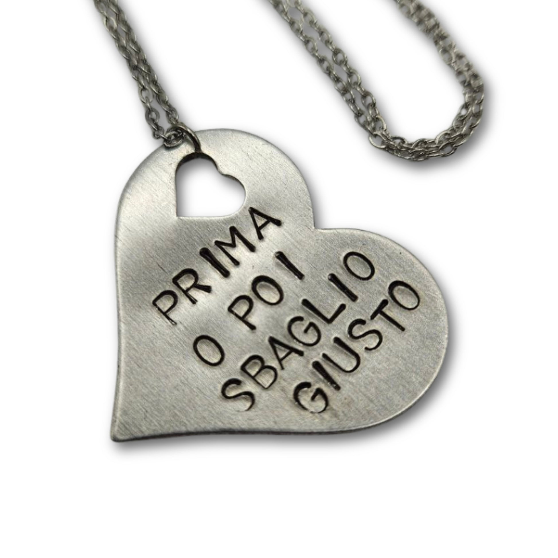 Per chi vive senza paura di tentare, sbagliare e riprovare. Questa collana unica è un promemoria di resilienza, perfetta per chi crede che ogni errore sia solo un passo verso la strada giusta. Il ciondolo in alluminio (circa 3 cm) è timbrato a mano con la frase "PRIMA O POI SBAGLIO GIUSTO", un mantra per chi non si arrende mai.