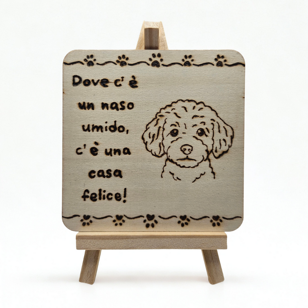Tavoletta in legno “Dove c’è un naso umido, c’è una casa felice!” – con cavalletto